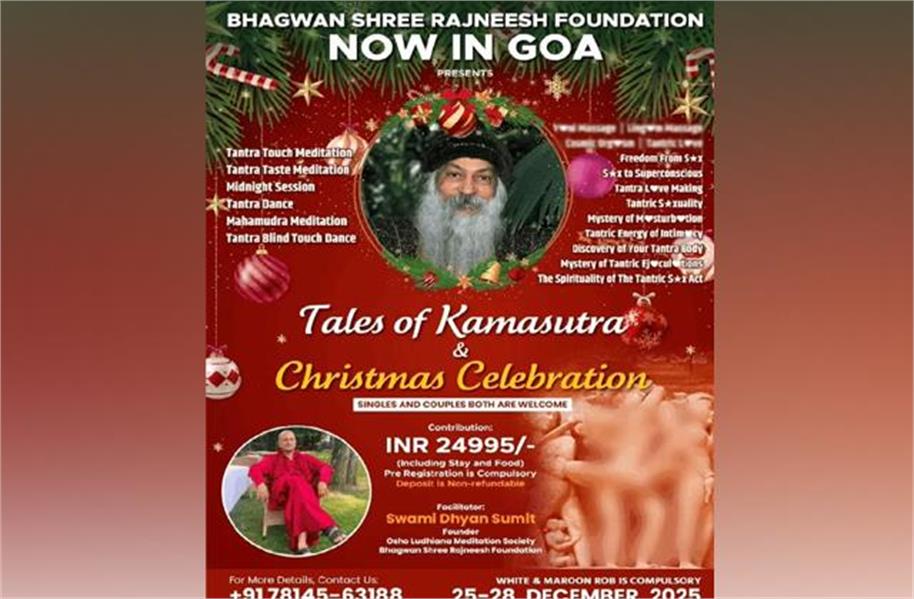 A major controversy has erupted over the proposed ‘Tales of Kama Sutra and Christmas Celebration Camp’ in Goa. A poster that went viral on social media, featuring the name of the Osho Ludhiana Meditation Society, obscene images, and several objectionable events, has sparked the entire issue. Upon the poster’s appearance, a Goa-based social activist filed a complaint with the Panaji police, prompting the police to take immediate action and temporarily postpone the event. The poster listed the camp fee as ₹24,995, along with the booking number and the name of the organizer, Swami Dhyan Sumit, who is identified as a member of the Osho Ludhiana Meditation Society.